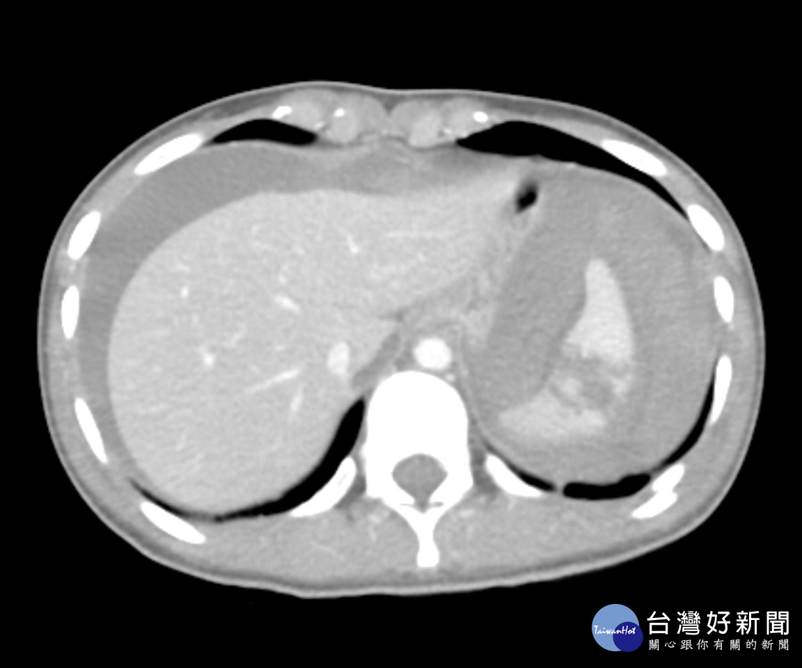 一位20歲就讀護理學系的吳姓女大生,日前於南投縣集集鎮上不幸發生車禍意外,緊急被送往鄰近的竹山秀傳醫院進行救治,急診醫師發現女大生臉色漸趨蒼白且有休克徵象,經超音波檢查與電腦斷層掃描診斷為脾臟破裂合併大量腹內出血(附圖),院方立即啟動重大外傷病人救護機制並安排緊急手術進行止血,術後女大生生命徵象漸趨穩定轉至加護病房接受後續治療,近日已康復出院休養。