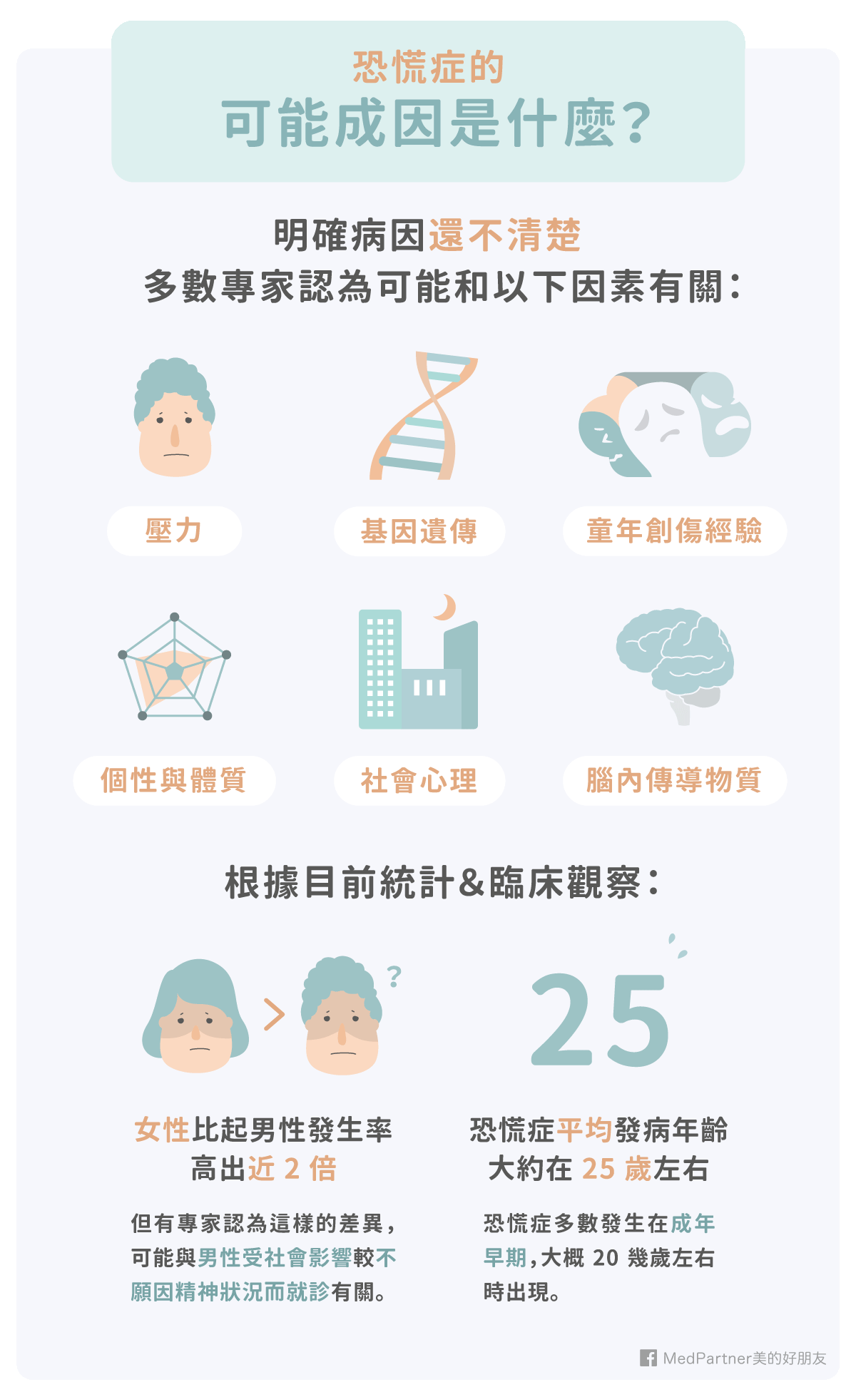 為了讓大家更了解恐慌症,MedPartner 團隊將用這篇圖文,讓大家更完整認識恐慌症的可能成因、常見症狀,以及預防和治療的方式,希望無論是恐慌症的個案本身,或者是家屬與社會,都能對這個精神困擾有更多的瞭解與同理。