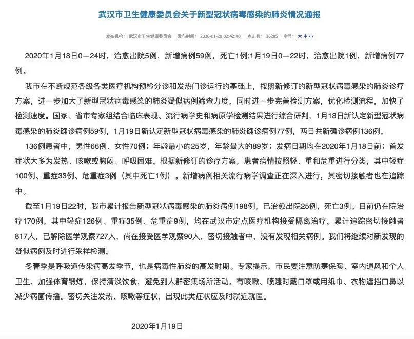 2020年1月20日凌晨武漢市衛生健康委員會發布關於新型冠狀病毒感染的肺炎情況通報:2020年1月18日0—24時,治癒出院5例,新增病例59例,死亡1例;1月19日0—22時,治癒出院1例,新增病例77例。兩日共新確診病例136例。