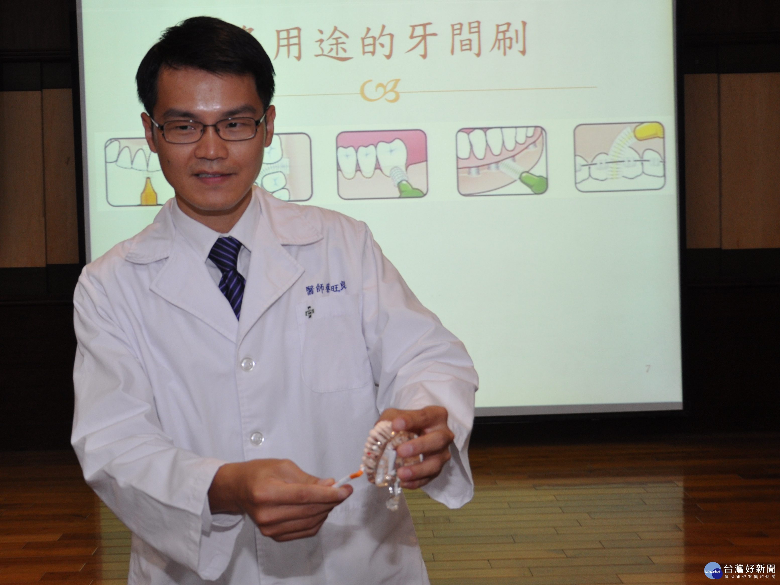 台南市立醫院牙科部蔡旺良醫師示範牙間刷使用方式。