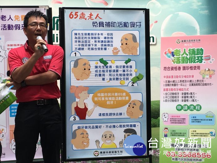 桃園市政府衛生局29日記者會特邀請社團法人桃園市牙醫師公會牙醫師與會講解配戴活動假牙時應注意事項及清潔與保養方法,除對長者宣導正確使用方式外,並使家屬了解活動假牙之特性,提升照顧者知能,期使民眾廣為周知,共同提升市民健康。