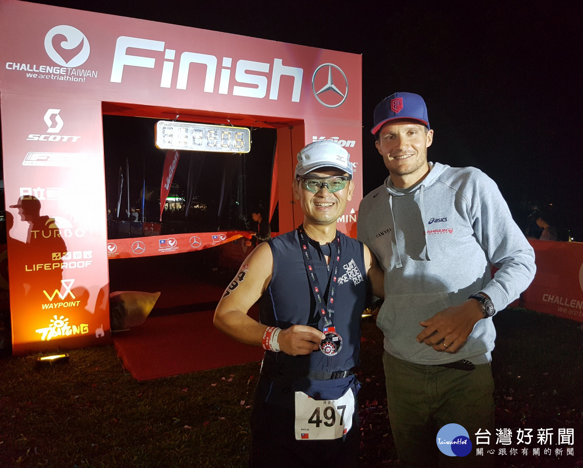 陳皇仲醫師參加超級鐵人三項226,抵達終點時獲得弗洛丹諾掛上榮耀的獎牌,開心合影。