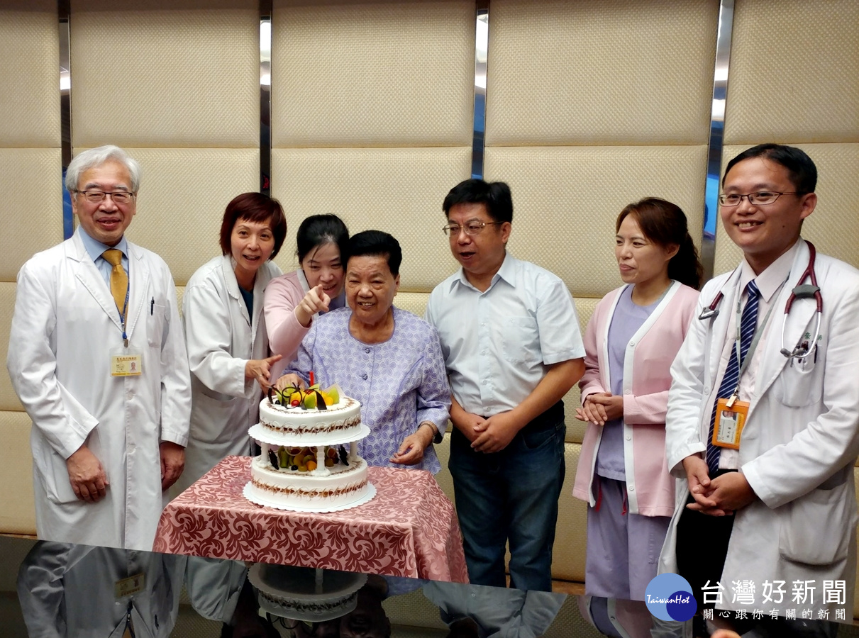 臺北榮民總醫院桃園分院兩個月前接獲一起高齡80歲的老婦人因心碎症候群導致心跳停止,經過主治醫師張天豪研判及搶救得宜將病人從鬼門關裡搶救回來,26日上午傅奶奶家屬為感謝榮醫桃分院醫師群的努力,致贈「醫德超群」錦旗給心臟內科主任王琛和其團隊,院方並買蛋糕為病患傅奶奶重生而慶祝。