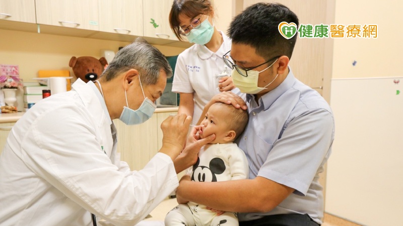 亞大醫院兒童醫學中心副院長林鴻志替寶寶做呼吸道融合病毒快篩。
